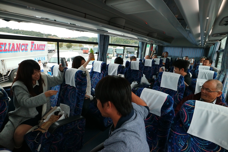 | 飛行機でひとっ飛びの旅行も良いですが、貸し切りの観光バスでガイドさんの名調子を聞きながら、のんびりと行く旅行も楽しいですよね。なにより、バスに乗り込んでいきなり「乾杯!!」の声が聞こえるようなのは大好物です。(笑) |