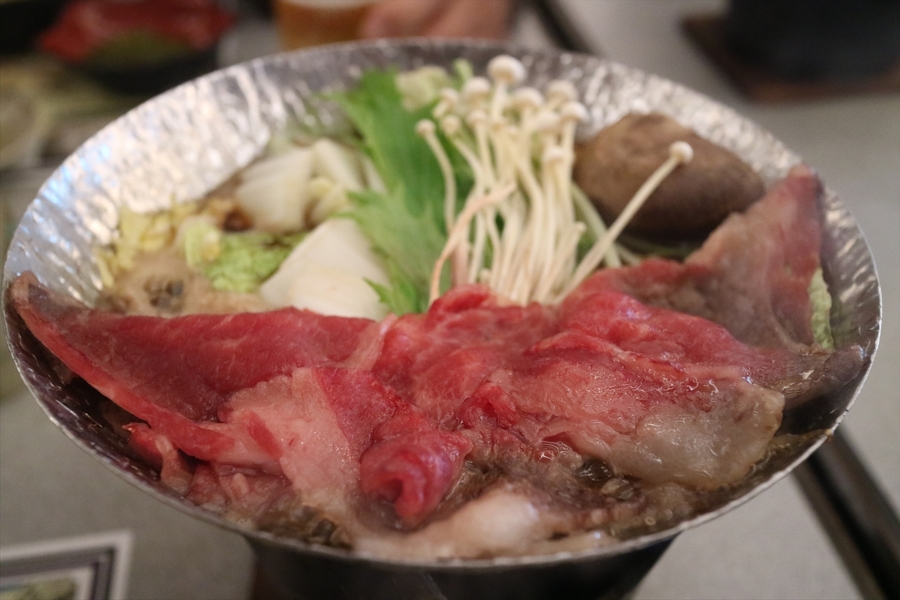 | バスの中で既に”できあがっている”人もチラホラ伺えますが(笑)、コチラに来たからには「松阪牛」を食べずにはおさまりがつきません。食べたのは「松阪牛のすき焼き」で、他にも一品料理が数品あり、最後はうどんで締めるという、たいへん満足のお昼ご飯でした。 |
