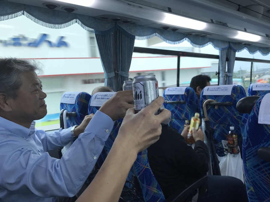 | 台風22号の影響で生憎の雨模様でしたが、予報では四国の南沖を通過するとのことだったので、山陰地方なら大丈夫だろうと、まずは例年のごとく「乾杯!!」から弊社の慰安旅行は始まります。(笑)これもバス旅行の醍醐味ですね。 |