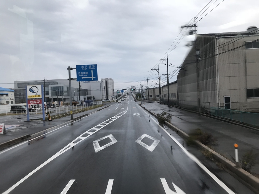 | 次の目的地へ行く道中で、かの有名な江島大橋(境港臨港道路江島幹線)を通ったのでバスの中からパチリとやったのですが、アングルが悪く、あの凄絶感が伝わらないですね〜(汗)腕が良ければこういう写真が撮れるのですが。。 |