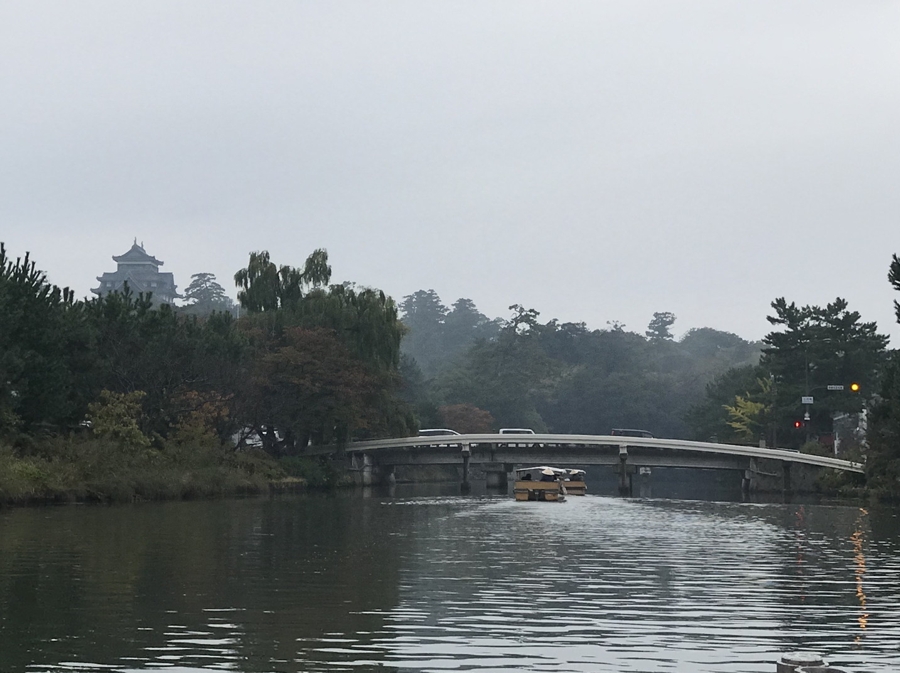 | 遊覧船に乗って松江城の外堀をめぐりました。多少の雨でも屋根が付いてるので問題ないですが、橋によっては桁下の低いところがあり、屋根が下がるのと同じようにお辞儀?をしないと通れません。船頭さんの歌声は素晴らしかったですが、島根県でなぜ吾亦紅と千春の歌だったのかは不明です。(笑)オマケ写真 |